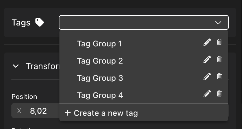 Add Tags to an entity via the Tags section at the top of the item’s properties panel. You can pick from the generic tags like Tag Group 1 through to Tag Group 4, or create your own with a more specific name.